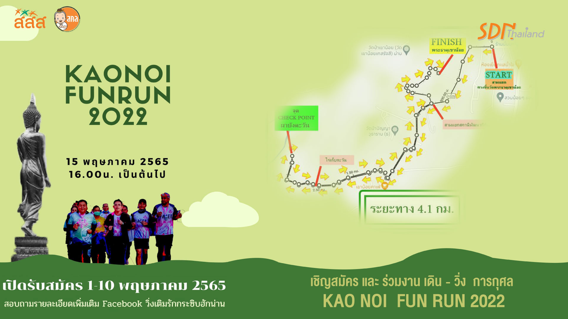 ภายใต้ชื่องาน KAO NOI FUN RUN 2022 ระยะทาง 4.1 กิโลเมตร วันรับสมัคร 1 – 10 พฤษภาคม 2565 ที่เพจ วิ่งเติมรัก กระซิบฮักน่าน โอนเงินผ่านธนาคากรุงไทย บัญชีชื่อวิ่งเติมรัก กระซิบฮักน่าน เลขที่บัญชี 679-8-72765-4 หรือสมัครด้วยตนเอง ที่ร้าน เอนกผ้าม่าน ค่าสมัคร คนละ 150 บาท รับจำนวน 500 คน ได้รับเสื้อ1 ตัว + น้ำดื่ม + ผลไม้ตามฤดูกาล รับเสื้อ วันที่ 13-14 พฤษภาคม 2565 ณ ร้านเอนกผ้าม่าน