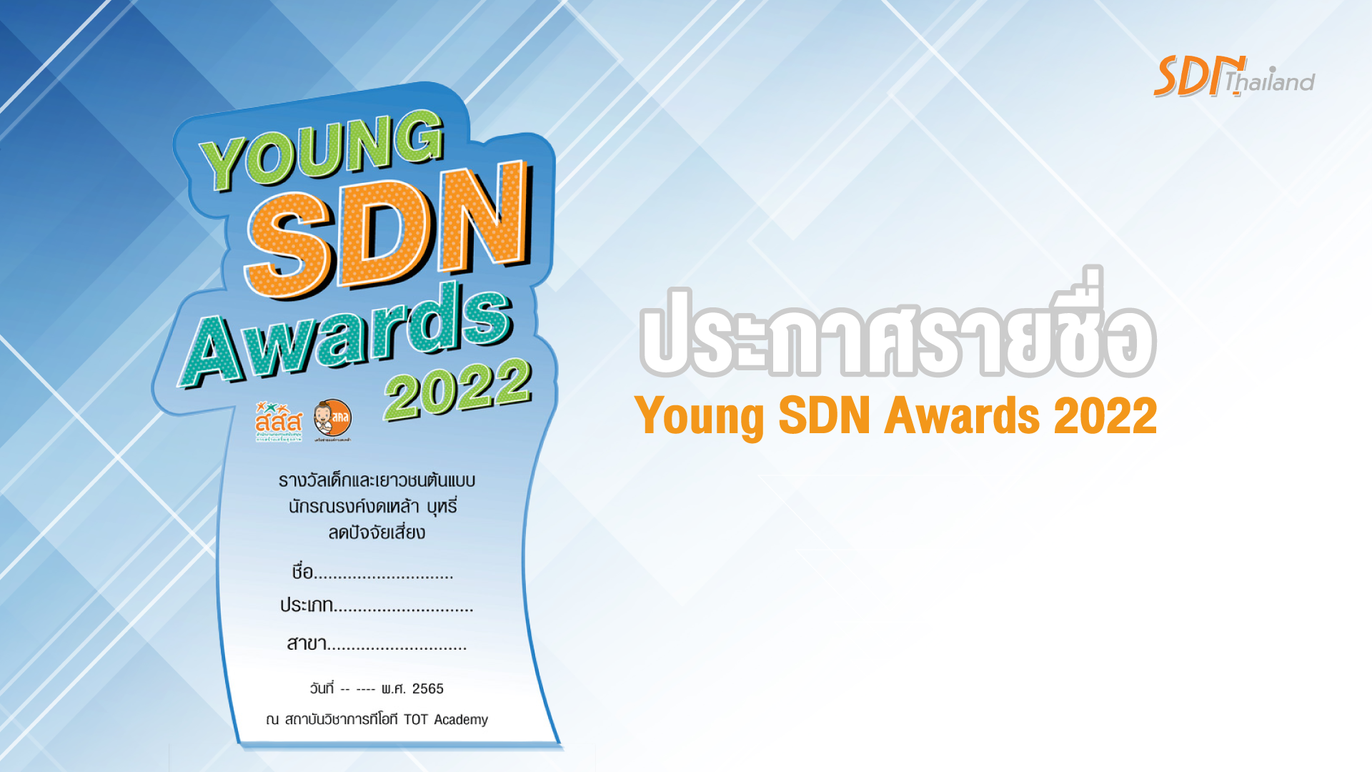 ประกาศรายชื่อผู้ผ่านพิจารณาเพื่อรับรางวัล เด็กและเยาวชนต้นแบบนักรณรงค์งดเหล้า บุหรี่ ลดปัจจัยเสี่ยง “รางวัล Young SDN Awards 2022 รางวัล Young SDN Idol และรางวัล ต้นกล้า Young SDN ”