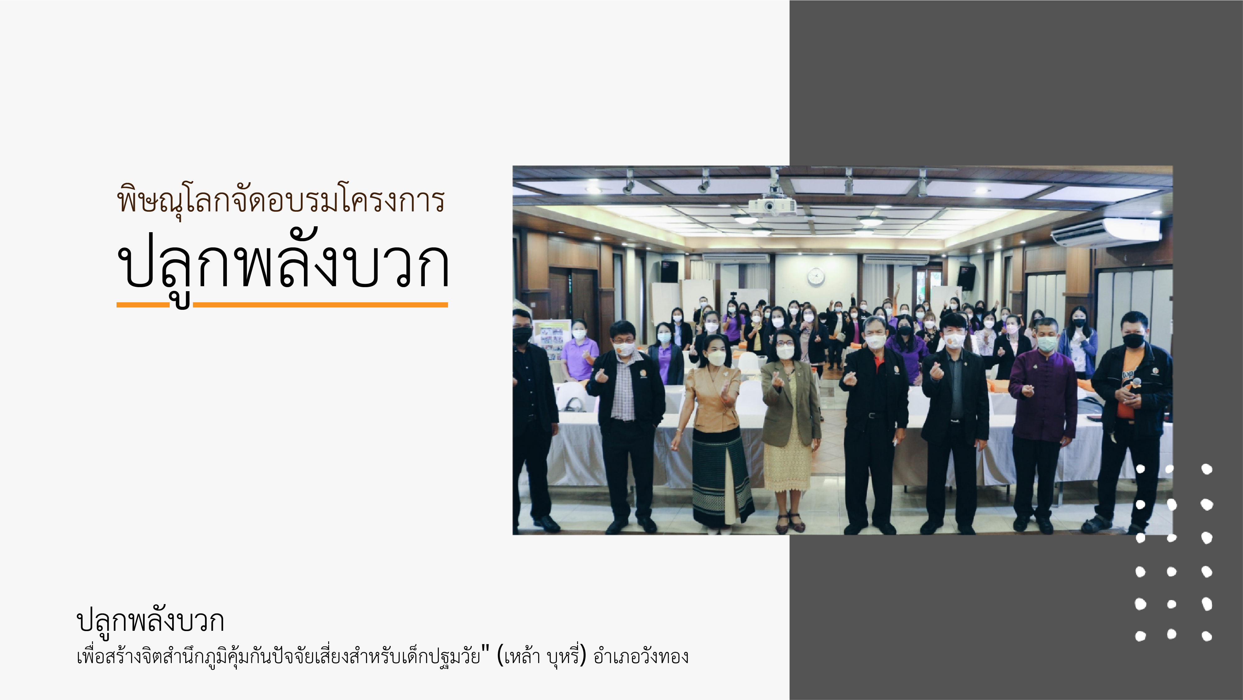 พิษณุโลกจัดอบรมโครงการ”ปลูกพลังบวกเพื่อสร้างจิตสำนึกภูมิคุ้มกันปัจจัยเสี่ยงสำหรับเด็กปฐมวัย” (เหล้า บุหรี่) อำเภอวังทอง .วันที่ 9-10 ตุลาคม 2564 ณ วนธารา เฮลท์ รีสอร์ท แอนด์ สปาเครือข่ายประชาคมงดเหล้าจังหวัดพิษณุโลก (สคล.พล.) ร่วมกับสำนักงานเครือข่ายองค์กรงดเหล้าทั้งระดับภาคและระดับประเทศ ได้ดำเนินโครงการอำเภอบูรณาการลดนักดื่มหน้าใหม่อำเภอวังทอง อำเภอต้นแบบนำร่องในจังหวัดพิษณุโลกและภาคเหนือตอนล่าง จัดอบรมโครงการ”ปลูกพลังบวกเพื่อสร้างจิตสำนึกภูมิคุ้มกันปัจจัยเสี่ยงสำหรับเด็กปฐมวัย” (เหล้า บุหรี่) อำเภอวังทอง 29 ศูนย์ เพื่อวางแผนบูรณาการโครงการ ฯลฯ และบูรณาการกิจกรรมส่งเสริมเด็กปฐมวัย ผู้ปกครอง และเยาวชนอำเภอวังทอง ลดนักดื่มหน้าใหม่ในพื้นที่ และส่งเสริมสุขภาพเยาวชนในภาวะการระบาดของเชื้อไวรัสโคโรนา 2019 (COVID-19) .อ.ประดับ สุริยะ ประธานเครือข่ายองค์กรงดเหล้วจังหวัดพิษณุโลก กล่าวว่า จากข้อมูลคนไทยดื่มเหล้ามากเป็นอันดับ 1 ของเอเชีย โดยเด็กที่เริ่มดื่มอายุน้อยที่สุดคือ 7 ขวบ ได้รับผลกระทบจากบุหรี่กว่า 66.8% นำมาสู่การร่วมมือระหว่าง สคล. สสส. สพฐ. และองค์กรปกครองส่วนท้องถิ่น จัดโครงการ “ปลูกพลังบวกเพื่อสร้างจิตสำนึกภูมิคุ้มกันปัจจัยเสี่ยงสำหรับเด็กปฐมวัย” เสริมเกราะป้องกันเหล้าบุหรี่ให้เด็กตั้งแต่ช่วงปฐมวัย รวมไปถึงเป็น “สื่อรักให้พักเหล้า” ชวนผู้ปกครอง ลด ละ เลิก สุรา ต่อไป.นายวราวุฒิ สายเปลี่ยน ผู้ประสานงานเครือข่ายองค์กรงดเหล้าจังหวัดพิษณุโลกกล่าวว่า โครงการครั้งนี้เป็นการนำร่องในพื้นที่อำเภอวังทอง โดยตามแผนงานแล้ว เราจะมีการดำเนินการกิจกรรมหลากหลายรูปแบบ กลุ่มเป้าหมายเริ่มตั้งแต่เด็กที่อยู่ในท้อง เด็กปฐมวัย ประถม ม.ต้น ม.ปลาย สายอาชีพ จนถึงระดับอุดมศึกษา โดยออกแบบกิจกรรมที่จะหนุนเสริมให้เกิดสภาพแวดล้อมที่ไม่เอื้อให้เกิดการดื่ม การบริโภคเครื่องดื่มแอลกอฮอล์ทำลายสุขภาพ เป็นต้นเหตุในการเกิดอุบัติเหตุทางถนน และ “ลดผลกระทบจากเครื่องดื่มแอลกอฮอล์ที่เป็นอุปสรรคในการพัฒนาที่ยั่งยืนต่อไป”#สคล#สสส#ํYSDN
