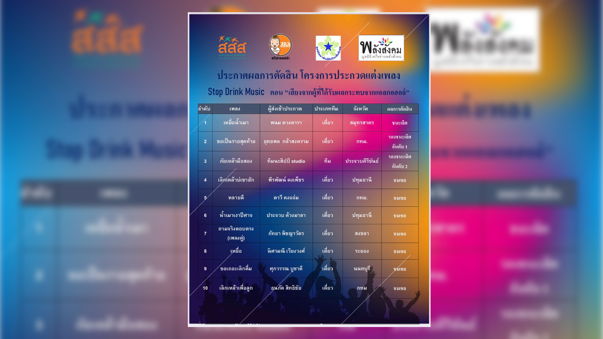 ประกาศผลผู้ชนะเลิศ การประกวดแต่งเพลงรณรงค์ ภายใต้โครงการประกวดแต่งเพลงลูกทุ่ง Stop drink music ตอนเสียงจากผู้ได้รับผลกระทบจากแอลกอฮอล์